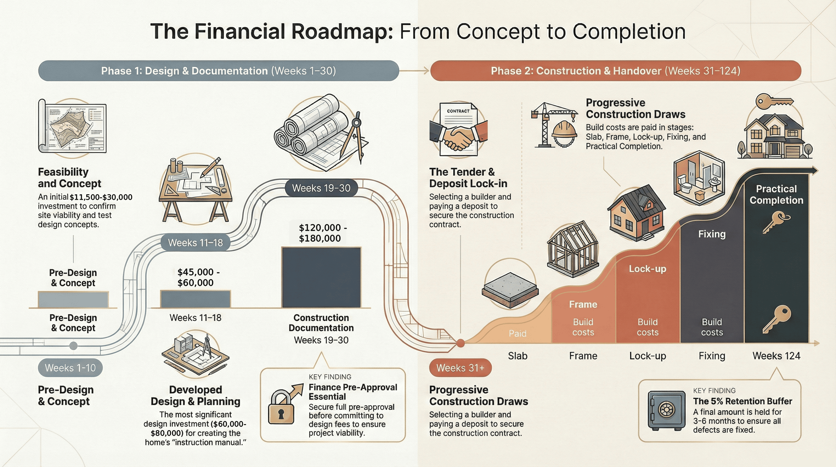 The financial journey of building isn't just about having enough money—it's about having the right money at the right time. Every phase builds on the last, and understanding this timeline helps you plan not just financially, but emotionally and logistically too.