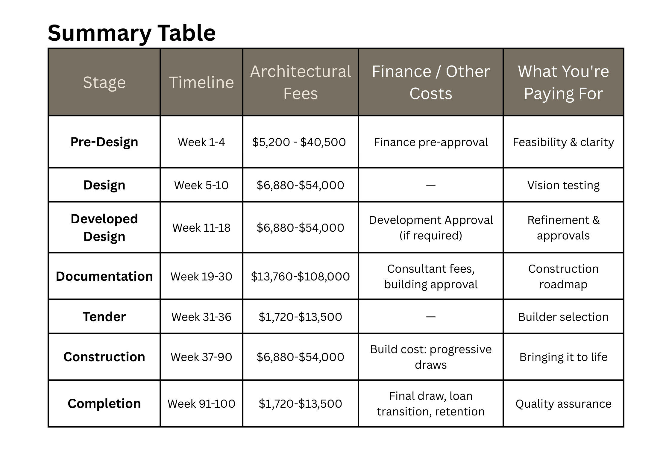 *Architectural fees do not include consultant fees, council fees, or construction costs